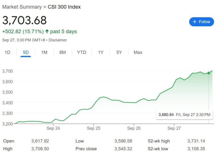 1. CSI 300 Index Recovery: The Chinese stock market saw a 15% jump this week, recovering all losses since May and now up ~9% YTD.