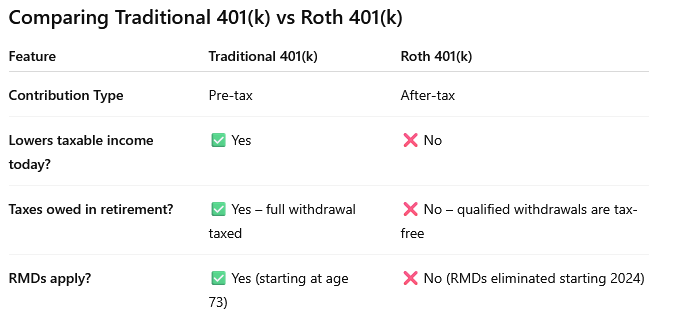 When planning for retirement, one of the key decisions employees must make is whether to contribute to a Traditional 401(k) or a Roth 401(k)—or a combination of both. While both accounts fall under the same annual IRS contribution limit ($23,500 for 2025, or $30,000 if age 50+), their tax treatment, timing, and long-term implications differ substantially.
