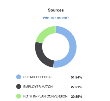 a) Log into fidelity.com and go to your 401(k) account dashboard. b) Click on your 401(k) plan to open the account details. c) Look for the section titled “I Want To…” and click on “View Balances.” d) On the balances page, you’ll see a “Sources” pie chart. This will break down your contributions by type.