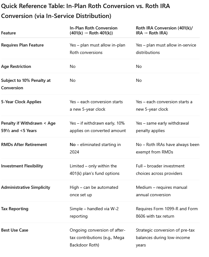 Table: Key Differences Between In-Plan Roth Conversions and Roth IRA Conversions (via In-Service Distribution)