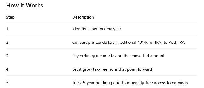 Roth Conversions, on the other hand, shine when you’re in a temporary low-income year—such as during a sabbatical, career change, or early retirement. They allow you to shift pre-tax dollars from Traditional 401(k) or IRA accounts into Roth IRAs, capturing future tax-free growth while locking in lower tax rates today.